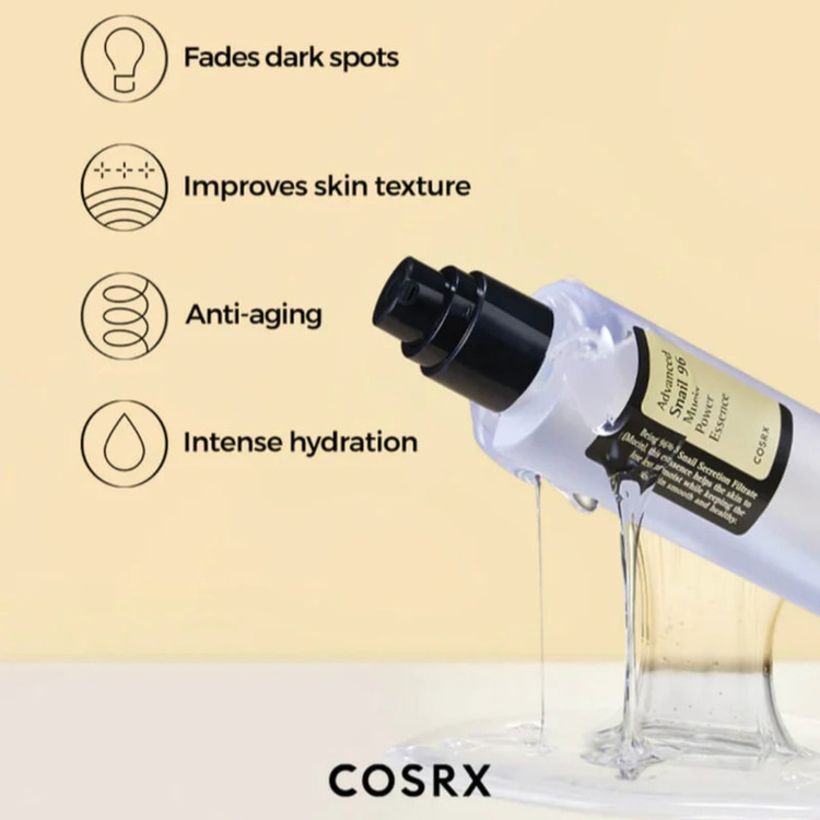 اسنس حلزون کوزارکس – آبرسان | 100 میل دارای بافت سبک و زود جذب است که درخششی طبیعی به چهره می دهد و سلامت پوست را به همراه دارد. سرشار از اسلایم حلزون می باشد که پوست را عمیقا تغذیه کرده و آن را در تمام طول روز، مرطوب و درخشان می کند. همچنین علاوه بر رطوبت رسانی و آبرسانی عمقی، به بهبود بافت پوست و کاهش لک ها کمک چشمگیری می کند.
